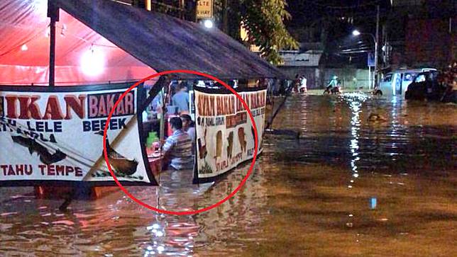 Akan tetapi, ada pemandangan yang menarik perhatian saat banjir menerjang kawasan tersebut. Pasalnya, sebuah warung pecel lele tetap buka meski banjir nyaris menenggelamkan meja tempat makan tersebut.